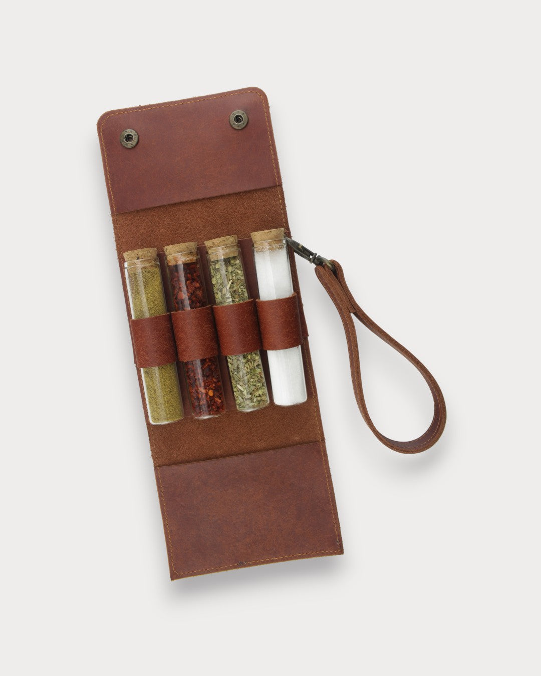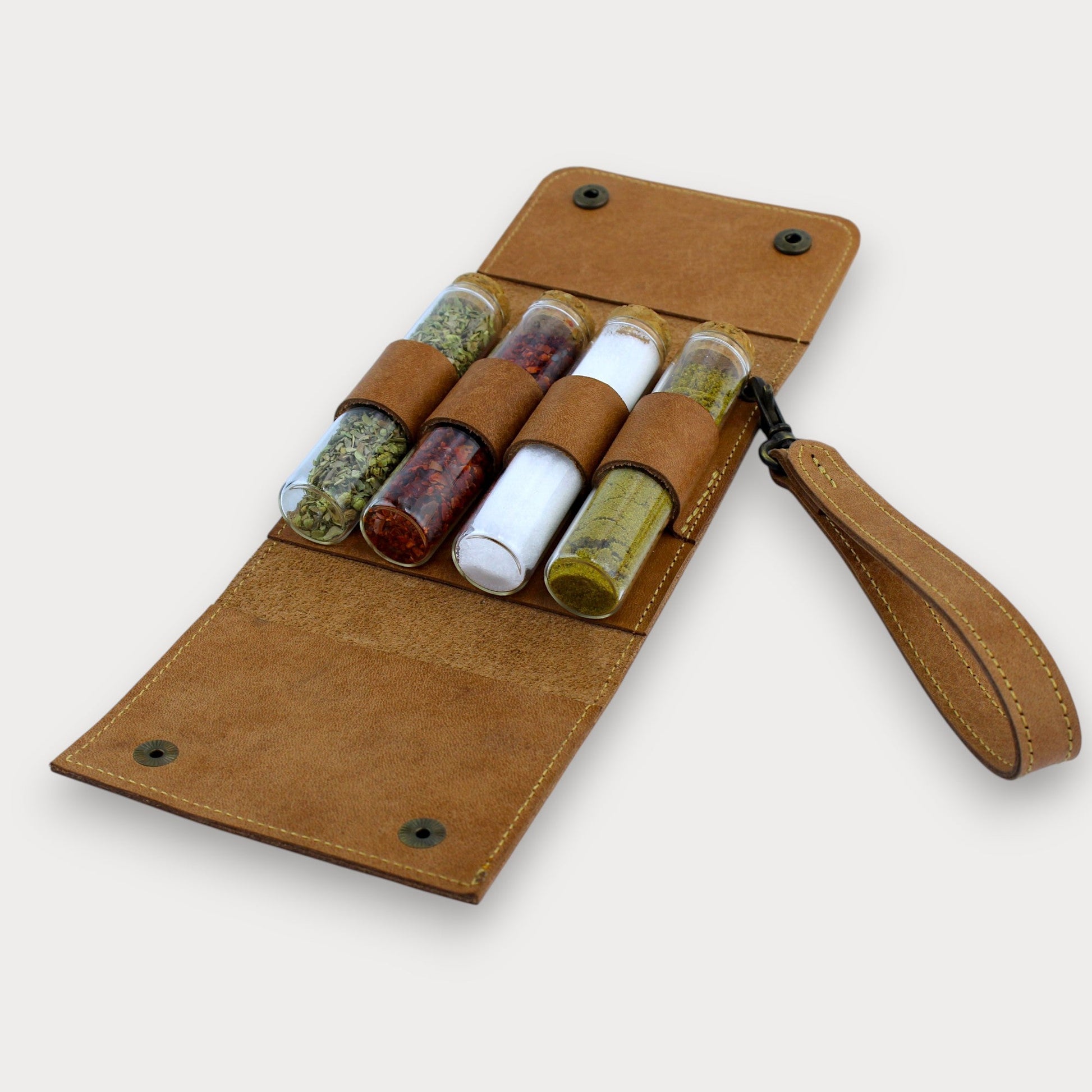 Der handgefertigte Leder Camping-Gewürzhalter wurde aus vollständig natürlichem Leder und Glasflaschen mit Korkverschluss gefertigt.