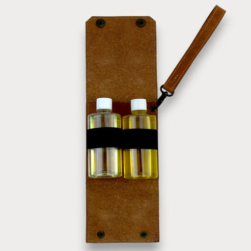 Das Set besteht aus 3 Glas-Gewürzflaschen mit Korkverschluss und 2 Kunststoff-Öl-/Soßenflaschen mit Deckel. Beide Teile sind in 100 % Lederhüllen untergebracht und können dank abnehmbarer Leder-Handschlaufe leicht getragen oder am Campingplatz aufgehängt werden.
